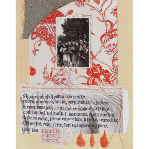 Negli ultimi anni mi sono focalizzata maggiormente sull’arte tessile e sui collage polimaterici.