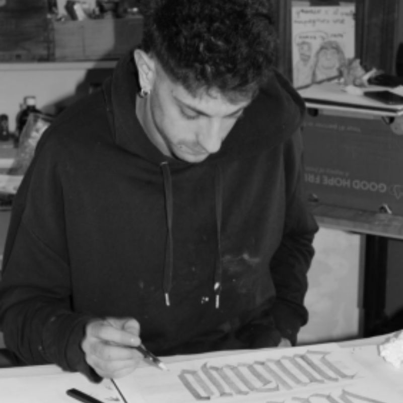 Si è laureato in Grafica d’Arte presso l’Accademia di Belle Arti di Brera, dove ha sviluppato un interesse per i processi di stampa, il gesto manuale e il rapporto tra scrittura e immagine. La sua pratica si concentra sulla produzione di segni e forme che rimandano a strutture alfabetiche e calligrafiche. Elementi che ricordano lettere vengono scomposti, deformati e ricombinati in composizioni astratte, in cui il segno perde il significato linguistico per trasformarsi in ritmo, materia e traccia visiva. Parallelamente, il suo lavoro si estende a pratiche editoriali e a interventi site specific, intesi come modalità di attraversamento e ascolto dei luoghi. In questi contesti, il segno e la forma diventano strumenti per riflettere sulla transitorietà, sulla memoria e su ciò che resta dell’esperienza umana nello spazio e nel tempo