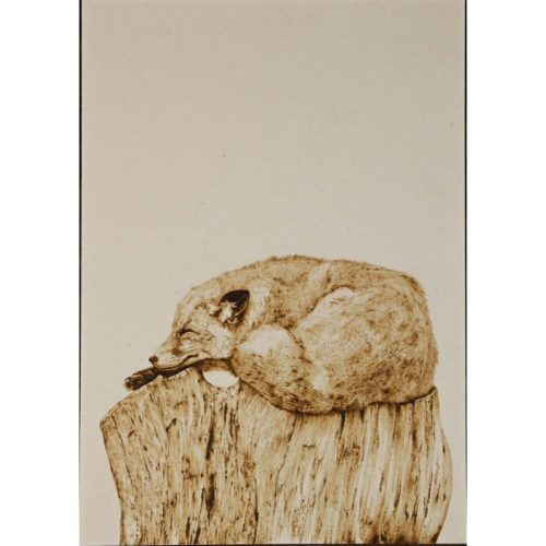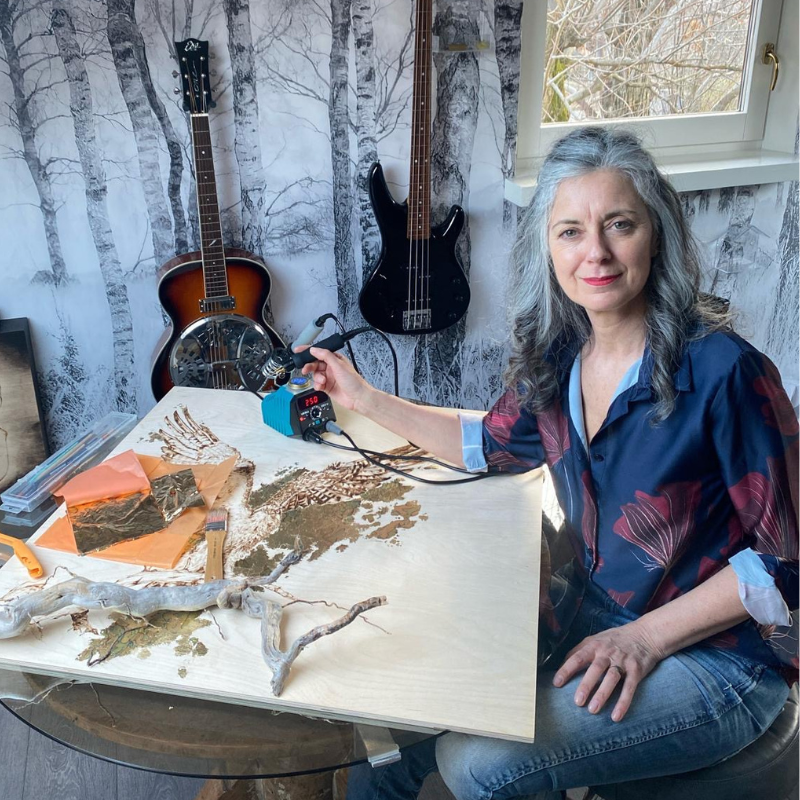 esplorano in particolare l’identità del mondo animale e della natura come forma emergente dalla materia, fondendo segno, memoria e superficie naturale. Animali e paesaggi che oscillano tra figurazione e simbolismo. La pirografia diventa strumento di indagine e narrazione, capace di trasformare le superfici destinatarie delle opere, legno e supporti naturali, in spazio simbolico e immaginativo dove l’osservatore è invitato a esplorare la densità emotiva e visiva delle forme naturali.