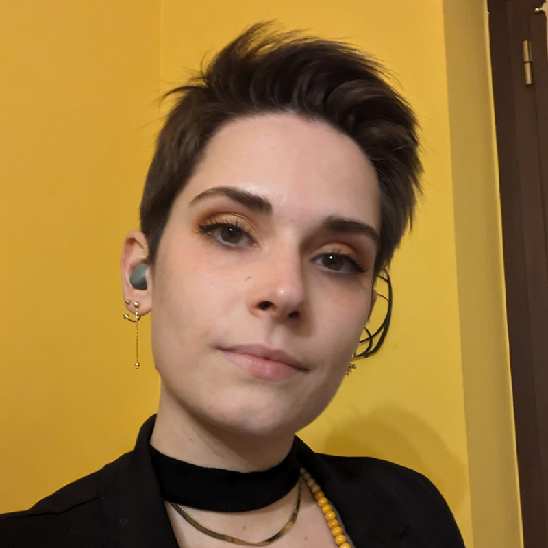 Sono nata a Rivoli nel 1997 e vivo a Cumiana, ho un gatto nero. Sperimento con il disegno (digitale e non), pittura, scultura, stampa linoleografica, fotografia, musica. Ho studiato al DAMS e solo negli ultimi anni ho riscoperto il disegno e la manualità.