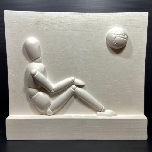 Tra il 2023 e il 2024, inizia a sperimentare anche gesso e resina, dando forma a un nuovo approccio scultoreo che rinnova il legame emotivo con il padre, scomparso in circostanze particolari durante la sua infanzia. In un contesto di ricerca di stabilità, Atzori trova un ordine simbolico nell’archetipo del manichino da disegno e nei “teatrini” che compone, dove ogni interferenza risulta azzerata.