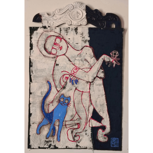 Nata e cresciuta nelle Marche (Italia), ho vissuto e lavorato a Roma collaborando con architetti in Italia, Lussemburgo e Stati Uniti. Dal 1999 vivo a Milano, dove realizzo lavori su commissione privata in Italia e all’estero. Soprattutto esploro l’essere umano, a partire dalla figura femminile. Nella mia ultima serie “Girls with Rings” distillo la perdita e il recupero dell’identità attraverso un segno essenziale, che si affida alla composizione dove le cuciture appaiono come ferite e al tempo stesso come ricuciture, donando alla superficie una storia viscerale. Anelli, intrecci simili a catene e acconciature di ferro battuto oscillano tra ornamento e costrizione, mentre il volto maschera traduce la mia eredità personale in una riflessione più ampia sui condizionamenti sociali e di genere. Il conflitto tra conformità e autenticità è al centro della mia ricerca; rappresento così un atto di transizione e di ricerca d’identità.
