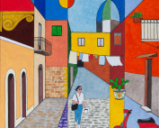 Esprime inoltre con l’uso del colore e della linea una sua personale interpretazione della sicilianita’, utilizzando in alcuni lavori i principali simboli della Sicilia.