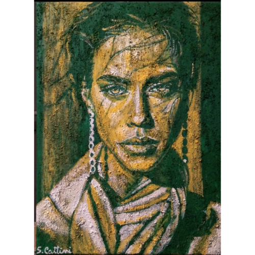 Autodidatta, lavora a matita, carboncino, gesso e, ultimamente, con acrilico mischiato a sabbia, cristalli, glitter e altro materiale.