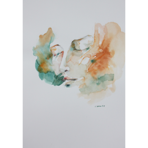 Carla Massimetti Tecnica: Acquerello Anno: 2021 Dimensione: 30 x 42 cm Descrizione: C’è una ragazza, Maud, con gli occhi chiusi e i capelli rossi. Sicuramente sogna. Si capisce dai contorni incerti del viso che sconfinano in una nebbia: è il sogno che fa così, scioglie i pensieri, li fa colore.