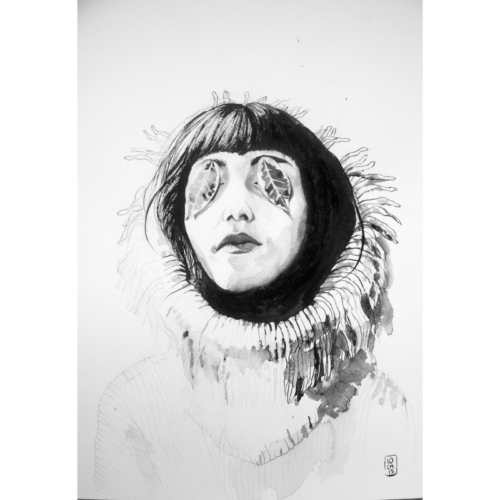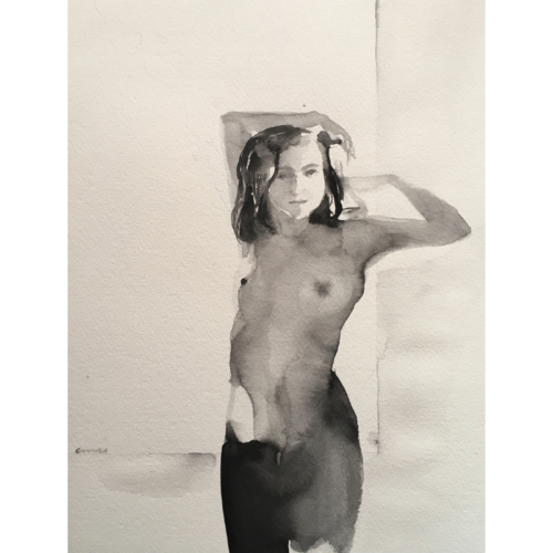 Carla Massimetti Tecnica: Acquerello Anno: 2021 Dimensione: 30 x 23 cm Descrizione: Una ragazza tiene un’ampolla su una spalla e si fa ritrarre con quest’idea liquida che allaga il mondo: è una carta della Temperanza, è un Acquario minuscolo. È Zoé è lei il pesce saltato fuori dall’acqua; e però respira e lo fa bene, controcorrente.