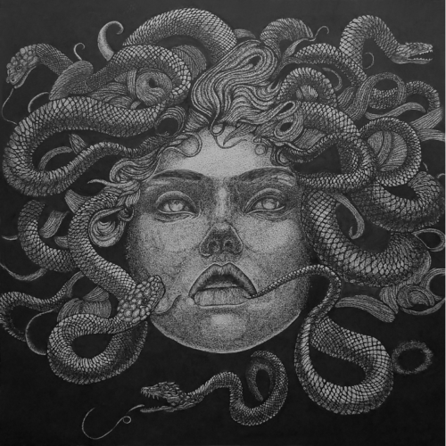 Ambra Mirabito Tecnica: Disegno a china su cellulosa Anno: 2025 Dimensione: 50 x 50 cm Descrizione: Il progetto "L’Eterno Femminile: Tra Mito e Santità" è una serie di ritratti di figure mitologiche, sante e martiri che celebra l’archetipo femminile in tutta la sua complessità e profondità. In questo nuovo ciclo di opere che unisce il regno del mito con quello del sacro, le donne emergono come ponti tra mondi. Dee mitologiche, eroine della tradizione e sante diventano il punto focale di uno studio intimo e universale sul potere femminile, svelandone le molteplici sfaccettature: protettrici e guerriere, madri e martiri, guide spirituali e custodi di miti.