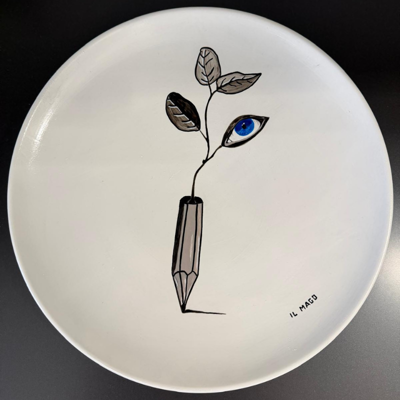 L’opera è concepita come un’illustrazione su ceramica. L’uso di un oggetto quotidiano, come in questo caso un piatto, riconvertito a supporto pittorico, lo spoglia della sua funzione abituale per collocarlo in un contesto onirico, se vogliamo ironico o bizzarro. Tutto ciò per provocare shock, stupore o una rilettura della realtà, liberare l’inconscio, contestare la logica razionale e sovvertire le regole sociali attraverso la poetica dell’oggetto e dell’illustrazione.