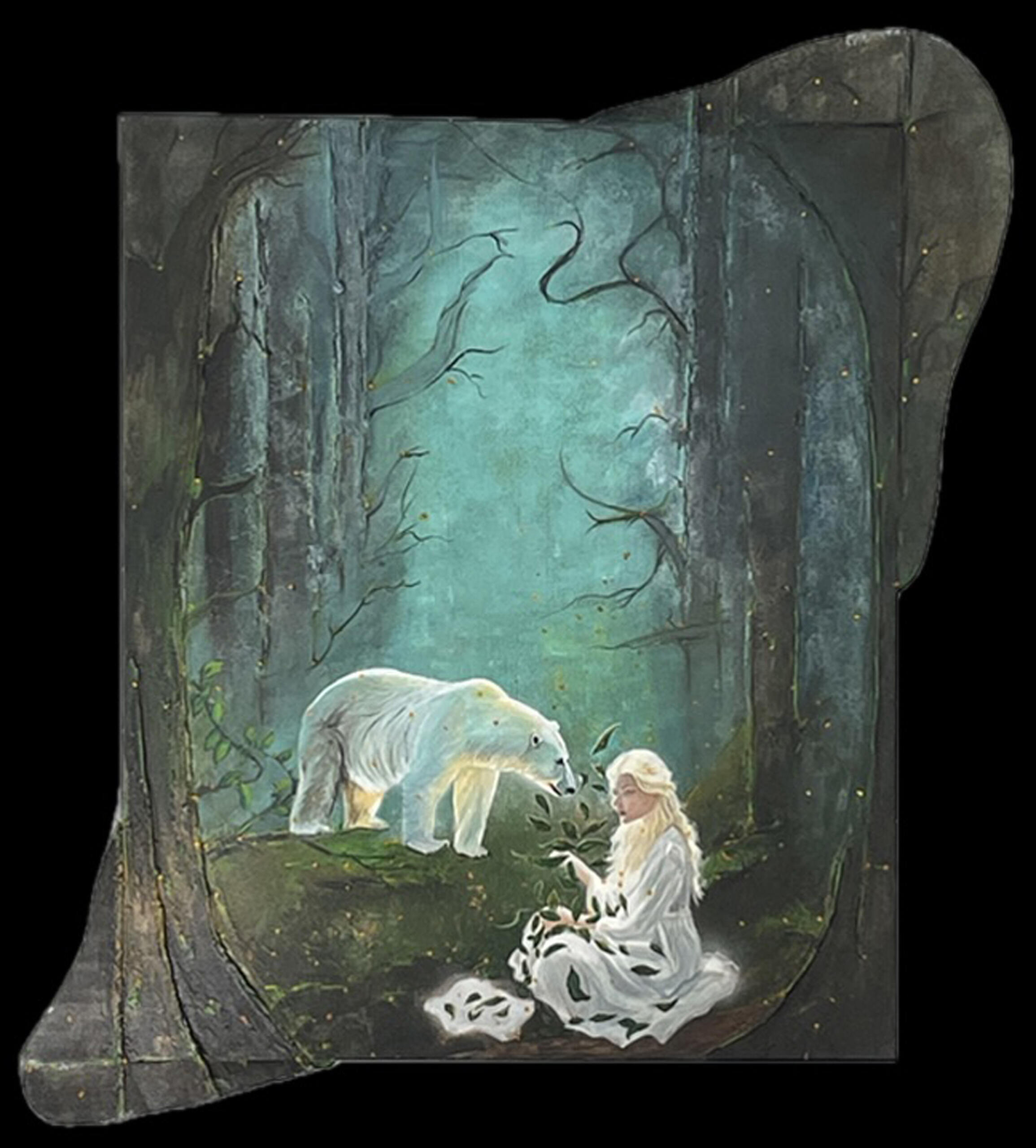 A young woman sitting in a forest, reading the leaves of the trees, is being observed by a polar bear.