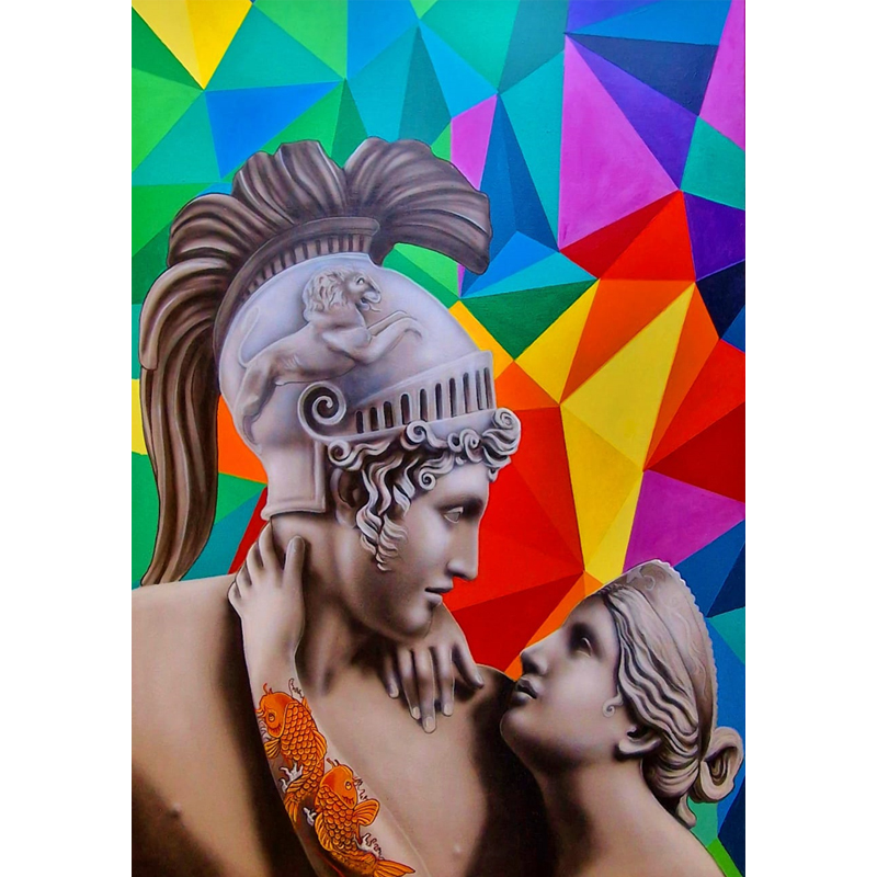 Descrizione: Il quadro rappresenta una scena di intensa passione e connessione tra Venere, la dea dell’amore, e Marte, il dio della guerra. Venere, con i suoi tratti delicati e il suo sguardo dolce, si avvolge attorno a Marte, il cui corpo muscoloso e ben definito trasmette forza e determinazione. La postura di Marte è fiera e sicura, emanando un senso di protezione e potere.