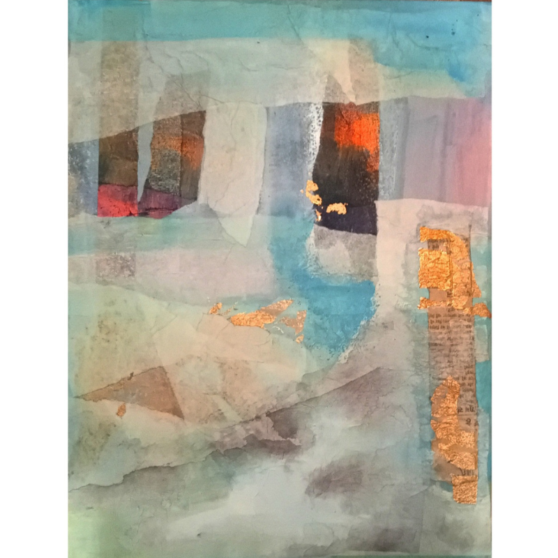 Descrizione: L’opera si distingue per un equilibrio raffinato tra trasparenze acquose e inserti materici, dove le campiture azzurre e grigio-verdi costruiscono uno spazio sospeso e contemplativo. Gli interventi in foglia oro introducono accenti luminosi che spezzano la morbidezza cromatica, creando punti di tensione e preziosità.