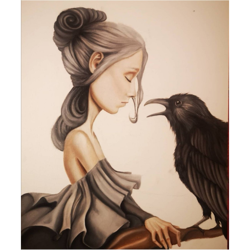 Descrizione: In un silenzio sospeso, quasi rarefatto, una figura femminile si abbandona al tempo dell’attesa. Gli occhi chiusi custodiscono un mondo interiore, intimo e insondabile in cui la realtà sfuma nel sogno. Al suo fianco, un corvo vigile e inquieto custode di presagi e complice silenzioso.