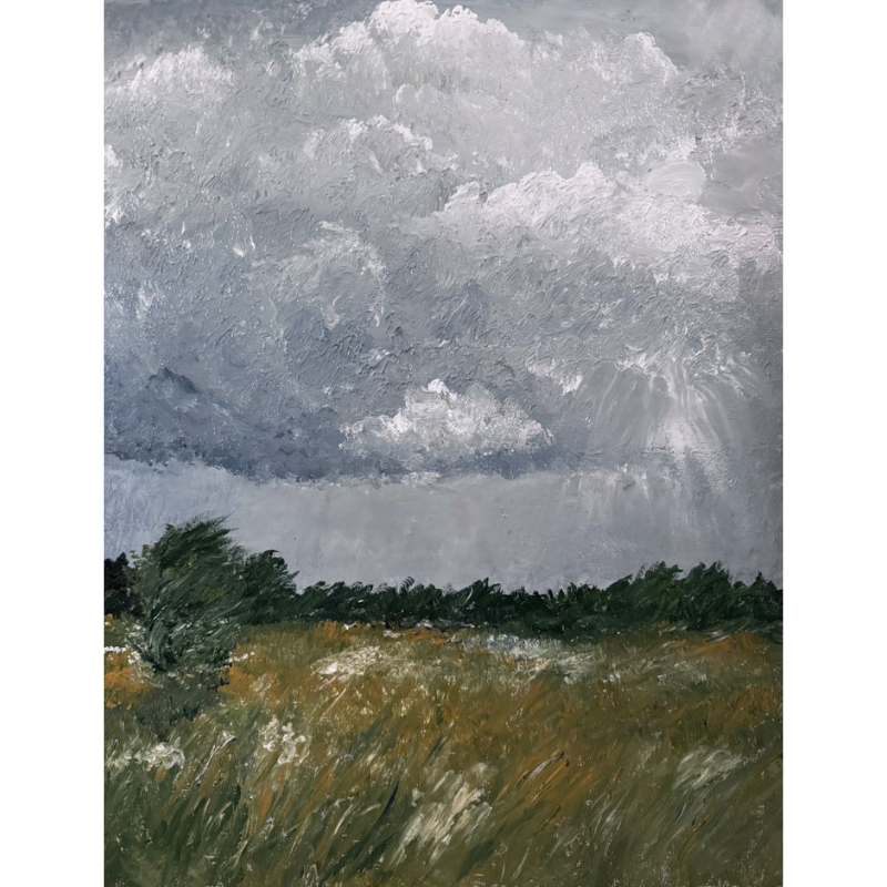 Descrizione: An expressive landscape dominated by a heavy, turbulent sky where thick clouds seem to rush over a wind-swept field. Energetic, textured brushstrokes create a strong sense of motion. The contrast between the cool tones of the sky and the warm green-gold grass forms a dramatic, living atmosphere, capturing the tense moment just before the storm arrives