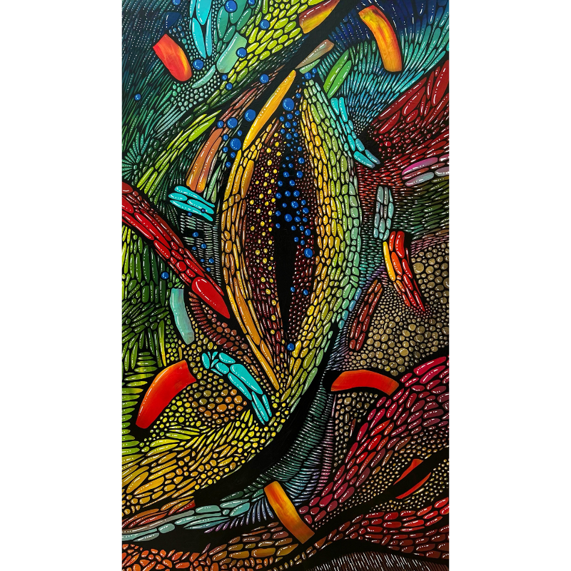 Descrizione: Quest’opera nasce da un movimento interno, da una tensione silenziosa che attraversa la superficie. La composizione si apre verso il centro, invitando lo sguardo a seguire un percorso fatto di strati, interruzioni e avvicinamenti lenti. I colori si addensano e si disperdono, creando un ritmo che trattiene e accompagna allo stesso tempo.