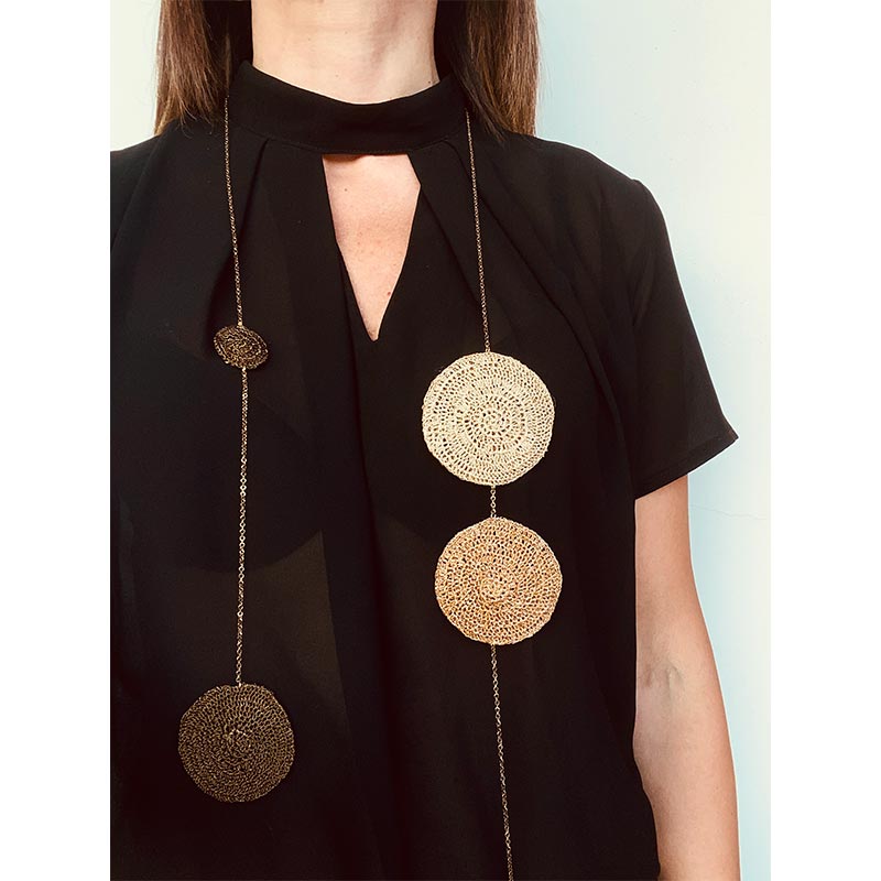 Descrizione: Un intreccio all’uncinetto che richiama le mappe celesti: nodi, fili e pieni/vuoti si trasformano in segni stellari, disegnando una costellazione da indossare. Ogni punto è una stella, ogni connessione una traiettoria, in un dialogo tra manualità antica e immaginario cosmico.