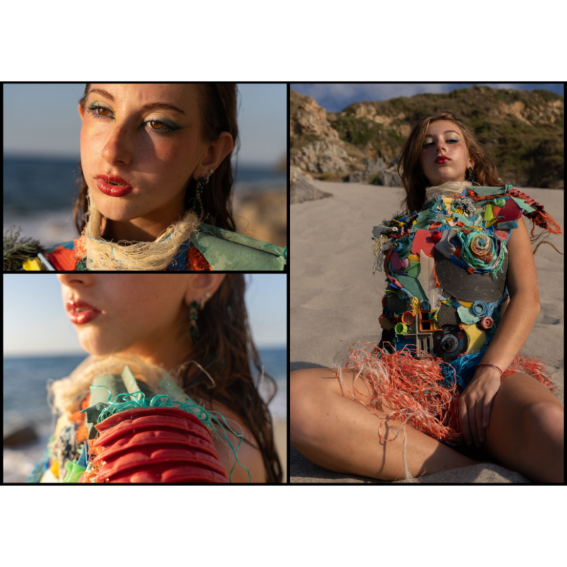 L’opera fa parte della serie “Creature dal mare” ed è realizzata utilizzando materiali raccolti in spiaggia. Creature dal mare è un’opera collettiva, fatta da molteplici attori: noi, i nostri scarti, il mare che ce li restituisce cambiati, di nuovo noi trasformati in ibridi di plastica e carne.