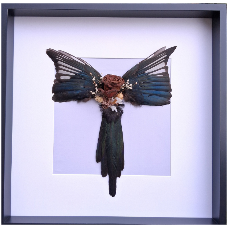 Descrizione: Cornice in legno con all’intero ali e coda di gazza eticamente recuperati e tassidermizzati. Il corpo della gazza è sostituito con una composizione di fiori secchi e stabilizzati.