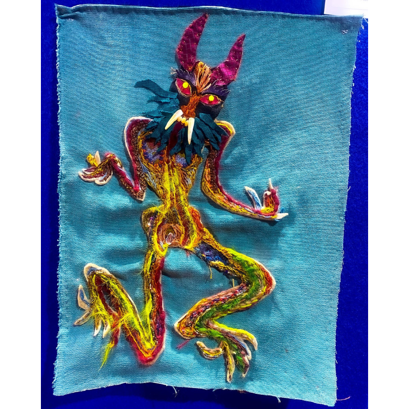 Descrizione: Le opere presentate con il nome “ demoniache” vogliono raccontare l’energia selvaggia e creativa, quindi divina, del femminile umano. Gli arazzi realizzati si riferiscono, sia all’aspetto divino, nel dare la vita, che mostruoso del femminile, da sempre intrinsechi in ognuna di noi. L’energia che ritroviamo rappresentata è ciclica ma anche caotica, instabile e mutaforma, mai debole , ma al contrario, si costituisce come una forza originaria vitale, magica ,sconvolgente e trasformativa. La mostruosità femminile si insinua in ogni mito o racconto e il terrore/orrore verso le donne è forse la piu’ importante verità dietro la misoginia. Con il termine “DEMONIACHE” si vuole rimandare al significato originale del termine greco “δαίμων “ che è quello dell’appartenenza a uno spirito divino. Il concetto di demonio ha subito una slittamento semantico nel tempo, passando da un’idea di entità divina a quella di spirito maligno. Con le opere tessili presentate si vuole omaggiare ed esaltare questo aspetto ambivalente/dualistico delle donne e, nello stesso tempo, rivendicarne l’assoluta libertà e connessione con l’universo.