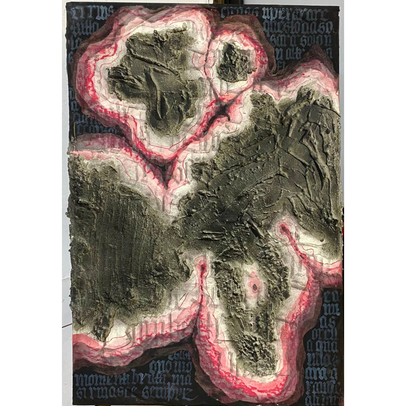 Il segno, derivato da strutture calligrafiche e alfabetiche, perde la funzione di scrittura per trasformarsi in forma astratta e materica. La superficie della tela diventa così uno spazio di deposito, dove parola, luogo e relazione si sovrappongono, dando origine a un’immagine che non racconta un evento specifico, ma trattiene una tensione emotiva e fisica, sospesa tra protezione e crollo.