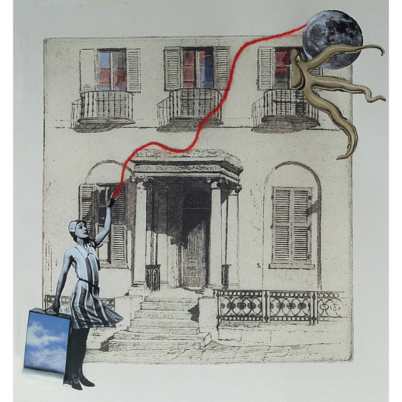 Descrizione: Il collage mette in scena due modalità opposte di desiderio verso lo stesso oggetto simbolico: la luna. Da un lato, un polpo tenta di impossessarsene in modo diretto e istintivo, quasi predatorio, rappresentando un desiderio che mira al possesso e alla appropriazione. Dall’altro, una figura femminile si relaziona alla luna attraverso un gesto di connessione: dalla mano parte un filo rosso che attraversa lo spazio e giunge fino all’astro, trasformando il desiderio in legame, relazione e tensione affettiva. Il filo rosso diventa così elemento centrale dell’opera: non strumento di controllo, ma di continuità emotiva e simbolica.
