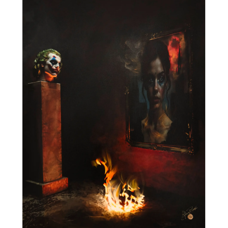 Descrizione: Vediamo da una parte, la forza distruttiva e anarchica rappresentata da Joker, dall’altra, la vulnerabilità e la ricerca di equilibrio incarnata dal ritratto femminile. due aspetti che possono convivere ed interagire, attraverso il fuoco simbolico della trasformazione, ci definiamo,