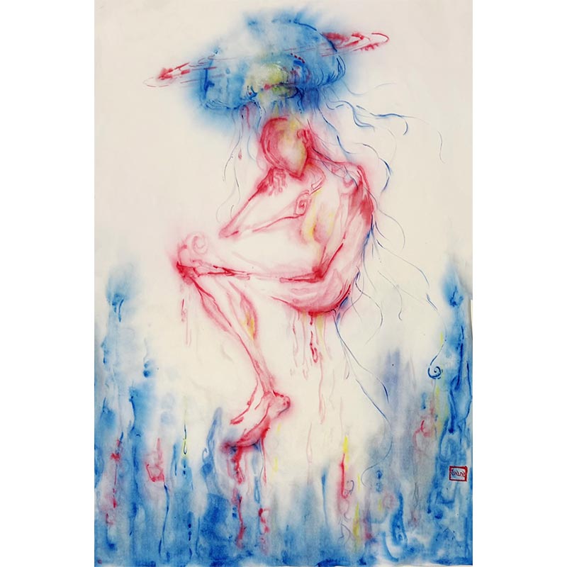 Descrizione: Eternal Life》draws inspiration from the “reverse aging” ability of the Turritopsis dohrnii (immortal jellyfish), exploring the fluidity and cyclical nature of life and consciousness. Though boneless and brainless, drifting with the currents, it can revert to a juvenile state to reborn,in the end dissolving into the sea upon death—echoing the Eastern philosophy of “life and death as intertwined cycles,” a form of immortality itself. The painting depicts a curled human figure entwined with the jellyfish, symbolizing post-trauma healing, identity transformation, and spiritual metamorphosis. Ink permeates the Xuan paper, mimicking the liquid existence of life and hinting at the individual’s eventual return to the environment.My work contemplates: When flesh perishes and entropic dissolution of form,can the spirit, like the jellyfish, through drifting and transformation, merge into the vast “sea of existence”,into the cosmic “sea of oneness”?