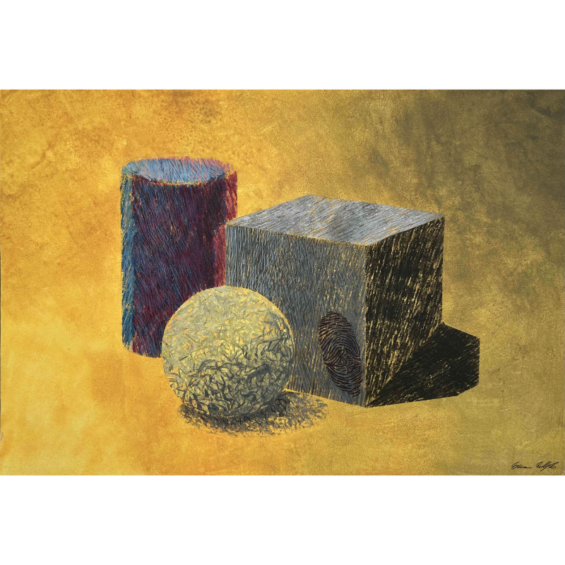 L’opera esplora il confine tra la geometria essenziale e la complessità tattile del mondo visibile. Attraverso una stratificazione di texture catturate dall’osservazione quotidiana, i solidi perdono la loro rigidità matematica per diventare corpi sensibili. L’inserimento dell’impronta digitale funge da baricentro concettuale: è il ritorno alla figura umana intesa come traccia, contatto e segno tangibile in un presente che tende alla smaterializzazione.