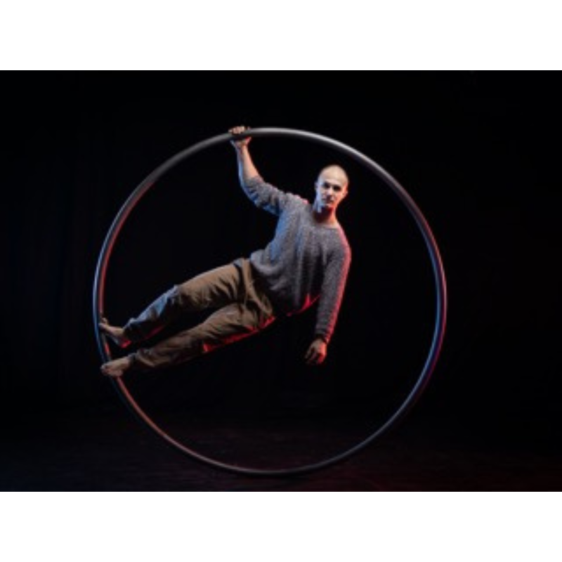 Descrizione: Acrobata si esibisce all’interno della ruota Cyr metallica accentuando i movimenti delle luci e il del suo corpo apparentemente statico.