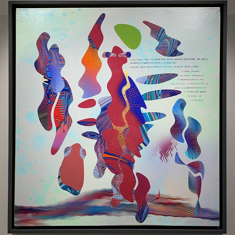 Tecnica: Phygital: tecnica digitale, stampa gicleé su tela, acrilici, foglia d’oro, timbratura a inchiostro