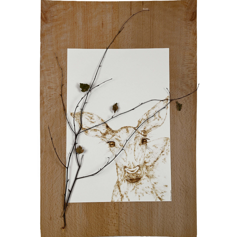 Tecnica: Pirografia su carta Torchon Fabriano 300gr inserti rami naturali, cornice piallaccio di faggio