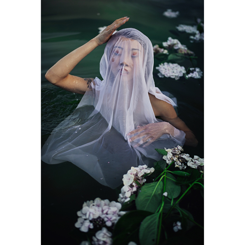 Descrizione: Tra fiori galleggianti e acqua silenziosa, la figura emerge come una delicata fioritura umana.