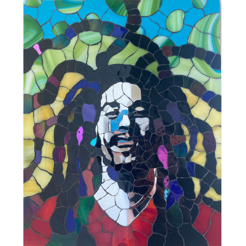 Tecnica: Mosaico di vetro artistico colorato e specchio su tavola di legno.