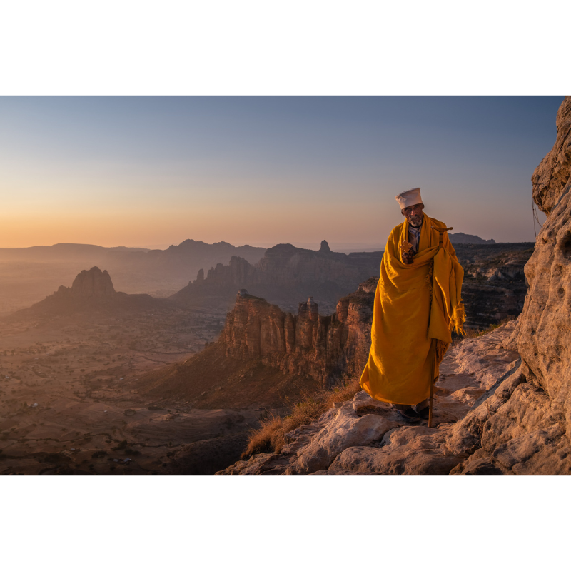 Descrizione: At dawn, the head priest of Daniel Korkor — one of the most dramatic rock-hewn churches of the Tigray Highlands — makes his way along the cliff to prepare for the morning rites. The valley below is still in shadow. He has done this every day for decades.