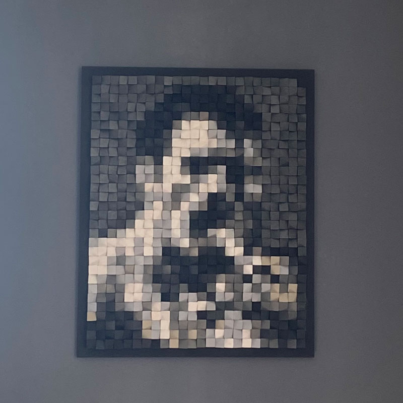 Descrizione: Riprendendo un immagine iconica di Freddie Mercury ed utilizzando la tecnica dei pixel ho voluto giocare sull’illusione visiva che viene accentuata sempre di più socchiudendo gli occhi. E un opera in cui ogni singolo pix di legno viene modellato ad una certa inclinazione giocando sulla percezione e sulla distanza dell’osservatore.