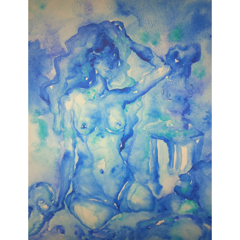 Descrizione: Nell’ opera il mito di Pigmalione viene reinterpretato sotto un’ altra luce. Il fuoco della rinascita appartiene interamente alla donna: la figura centrale emerge dall’evanescenza del marmo blu non come oggetto creato, ma come soggetto che prende coscienza di sé. Pigmalione è relegato in ombra, spettatore marginale di un prodigio che non gli appartiene più: la trasformazione della pietra in carne è l’allegoria di una liberazione interiore. La tecnica dell’acquerello, qui portata all’estrema evanescenza nella forma e nel colore, enfatizza il momento esatto in cui l’idea diventa corpo e l’essenza si fa presenza. L’opera celebra l’identità come affermazione vitale e autonoma di un’esistenza che sceglie, finalmente, di respirare.”
