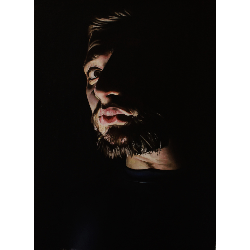 Attraverso questo autoritratto mostro solo una parte di ciò che sono. Una rappresentazione del reale di qualcosa che emerge dall’ombra, si fa vedere e comunica con chi osserva proprio attraverso l’espressione dello sguardo, uno sguardo che si lascia intravedere, che non cerca ma si mostra.