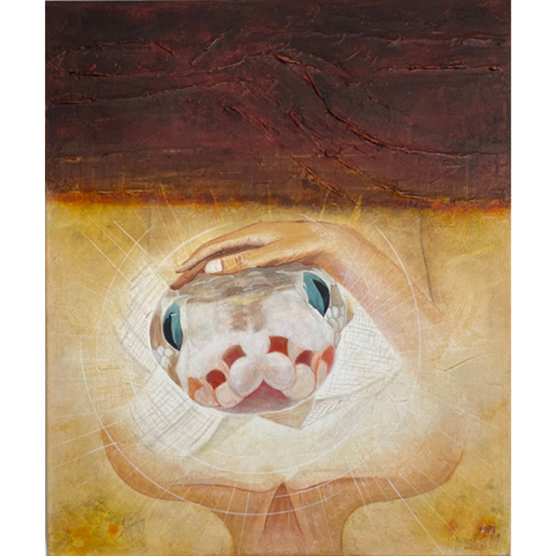 Descrizione: This paint shows my dream called “Un pedacito de tu luz”: Lying on my bed, I caress the big head of the white snake with emerald eyes, which comes out from my heart. Its light passed through all my body.