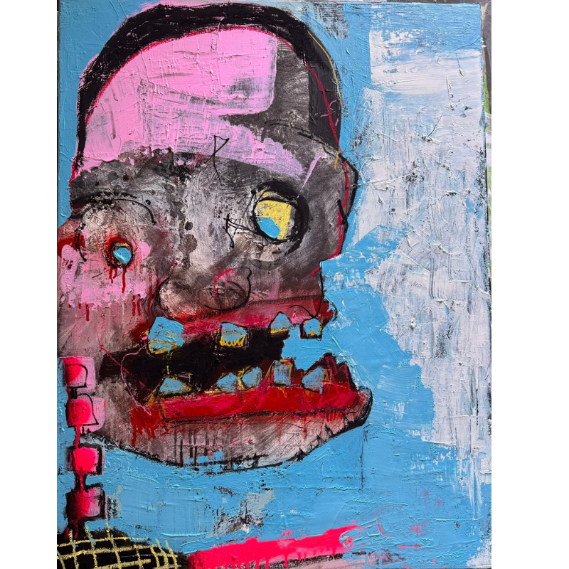 Una figura primitiva emerge su uno sfondo chiaro e frammentato. I tratti sono deformati, la bocca aperta, il segno si accumula e si rompe. La presenza sembra sul punto di cedere.