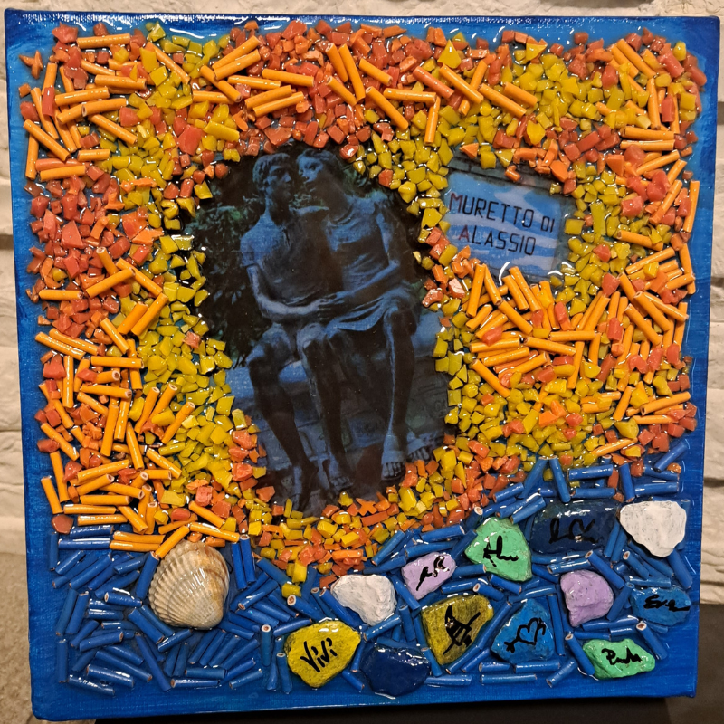 Descrizione: Opera con materiali riciclati fissati con resina su tela 20 x 20. Soggetto vuole riprendere i colori e i simboli di Alassio e del suo mare.