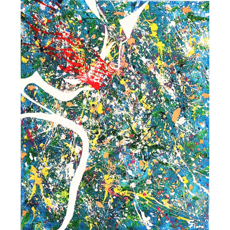 Tra gli spruzzi di colore — vivi, caotici, spontanei — emerge un profilo femminile definito da una linea bianca che attraversa la tela come un respiro. È una figura che non urla, ma afferma: Una donna che osserva, resiste, sogna e soprattutto decide di rinascere.