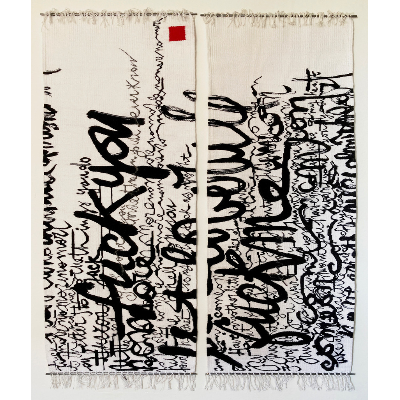 Descrizione: La composizione calligrafica sovrappone frasi e livelli di lettura in una complessità quasi inestricabile, che annulla la comprensione letterale del testo per lasciare accesso solo alle emozioni. Nel processo della tessitura ogni filo si arricchisce di un tempo narrativo capace di dare alle forme e alle parole una dimensione gravida di possibilità.