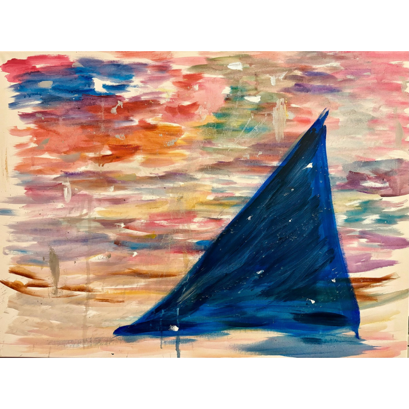 Descrizione: L’opera celebra coraggio e libertà nei miei vent’anni, lasciandosi andare alle emozioni. Una vela blu domina il paesaggio, circondata da pennellate rapide e colorate che si mescolano tra loro, evocando movimento e vita. Il soggetto nasce da un legame familiare: ritrovando i disegni di mio nonno, ho deciso di riprendere queste barchette che hanno accompagnato la nostra storia e la mia crescita.