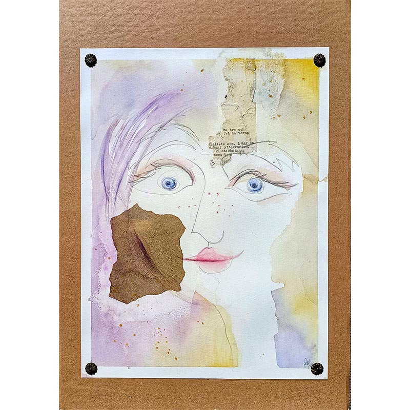 Descrizione: Questo autoritratto, terzo di una serie, è stato realizzato partendo da uno schizzo alla cieca dei miei lineamenti, su cui ho applicato un collage di pezzi di carta ritrovati, ma selezionati con cura: uno scuro e fortemente in contrasto con l’altro bianco avorio, movimentato da lettere scritte con una macchina da scrivere. Gli acquerelli sono stati applicati alla fine, lasciando andare il pennello e l’acqua là dove volevano fluire in quel momento. Le matite colorate e la grafite hanno definito occhi, labbra e qualche capello svolazzante. Tutto il processo è avvenuto in due giornate diverse, leggere e divertenti.
