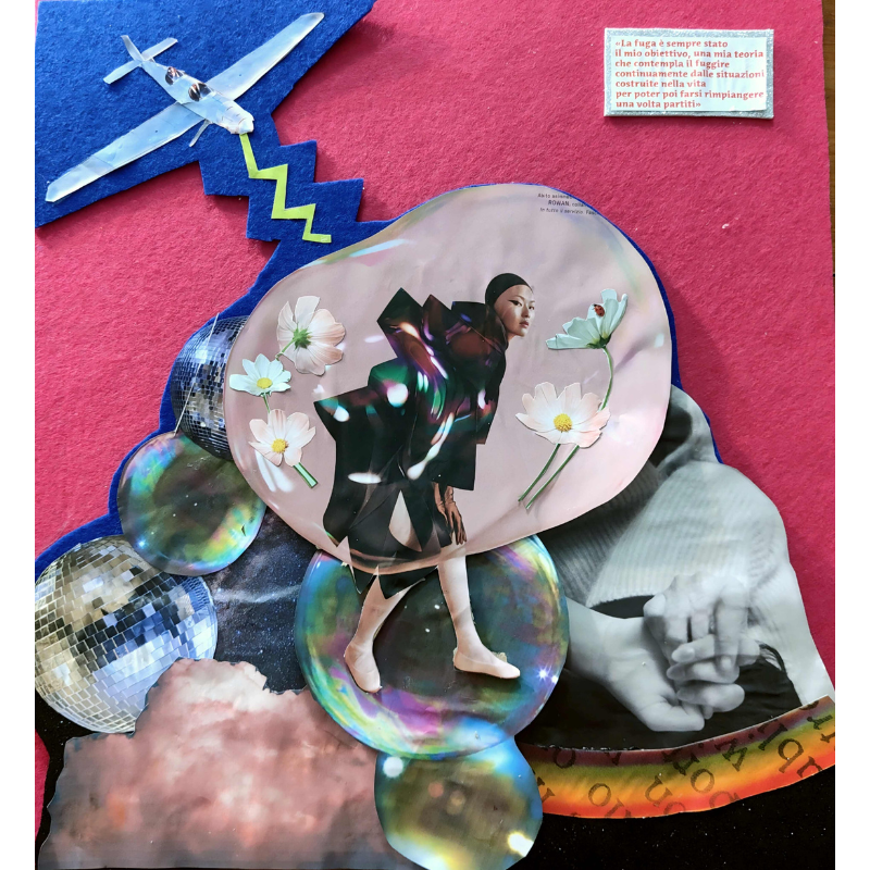 Descrizione: Fuggire non è scappare, è sabotare la realtà costruita per rifugiarsi nell’astrazione. Un aereo che squarcia il blu, bolle di sapone che proteggono un giardino interiore: l’opera è un manifesto per chi ha scelto di andarsene per non farsi mai rimpiangere.