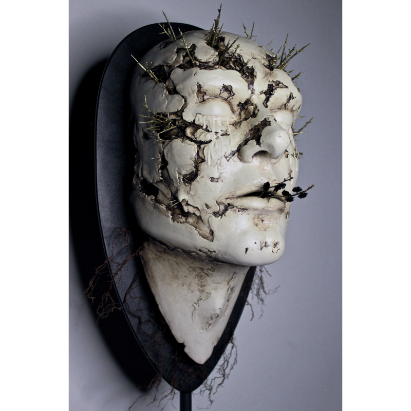 Quest’opera presenta un volto umano incastonato come un trofeo emotivo, levigato e incrinato, da cui emergono spine dorate e fiori neri dalla bocca. La pelle sembra fessurarsi sotto la pressione di un’emozione silente, non espressa a parole, ma vissuta con intensità bruciante.