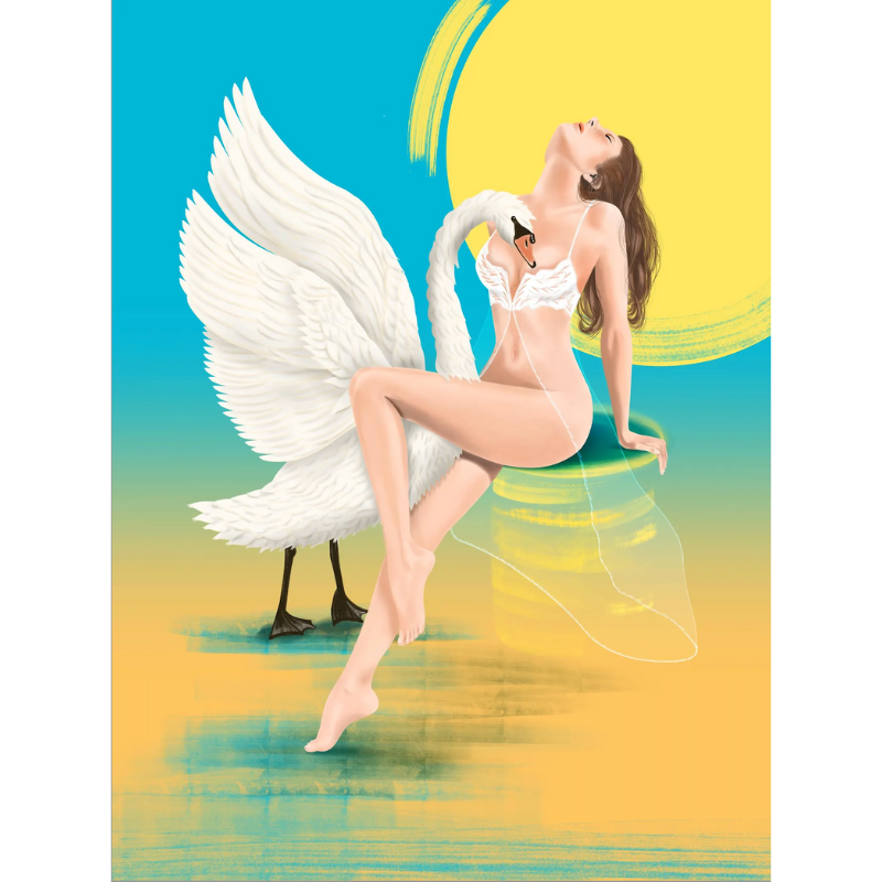 Descrizione: Una reinterpretazione contemporanea del mito di Leda e il Cigno. Il corpo femminile, esposto e vulnerabile, dialoga con la presenza del cigno in una tensione sospesa tra desiderio, potere e metamorfosi, immersa in un’atmosfera astratta di gialli e azzurri.