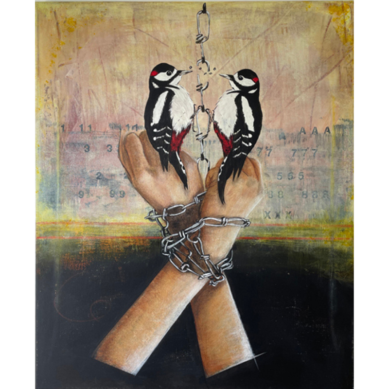 Descrizione: This paint shows : My hands are chained by the wrists and suspended from above and two Great Spotted Woodpecker birds are on each side. They peck to break the chain and cut the links. I am freed from my chains by the Great Spotted Woodpeckers.