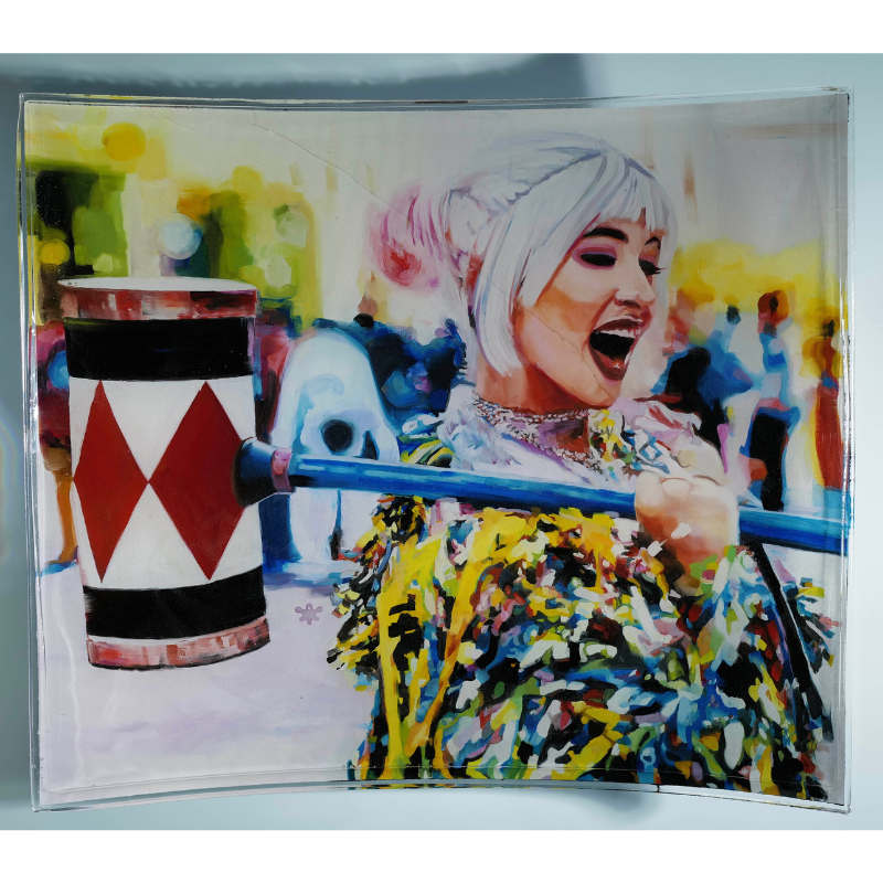 Descrizione: Un volto “pop” in primo piano — parrucca, trucco, bocca aperta nel grido/riso —impugna un grande martello da luna-park. L’oggetto teatrale amplifica l’idea diperformance: gioco, aggressività controllata, energia scenica. Sullo sfondo, unafolla sfocata evoca l’ambiente dell’evento e della visibilità pubblica: l’identità siaccende nello spettacolo e si misura con il desiderio di essere vista.