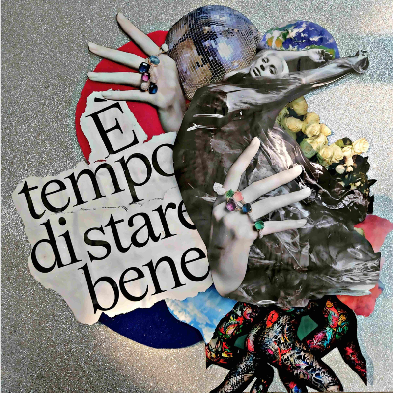 Descrizione: Basta scuse. In quest’opera ho preso la perfezione statica delle riviste e l’ho fatta esplodere. ‘È tempo di stare bene’ non è un invito gentile, è un ordine che do a me stessa mentre tutto intorno accelera. Ho incollato il lusso, i gioielli e le icone pop dentro un vortice di glitter e fiori, per catturare l’istante esatto in cui decidi di smettere di subire il caos e inizi a ballarci dentro. Le braccia si tendono, la disco ball gira, la terra sullo sfondo diventa piccola: quello che conta è la spinta verso l’alto, la ribellione di chi ha deciso che la propria felicità è un atto di guerriglia urbana che non può più aspettare.