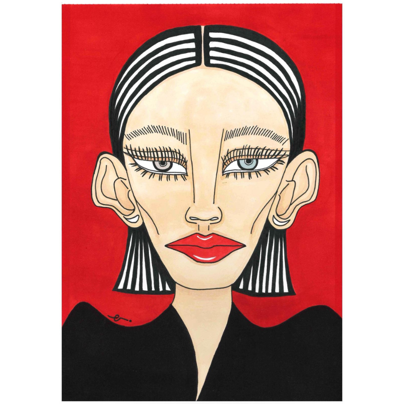 Descrizione: “Matilda” è un’opera che rappresenta una donna stilizzata con tratti accentuati e distorti, creando un effetto di bellezza brutale. Il colore dominante è il rosso, che infonde energia e passione all’immagine. Ho focalizzato l’attenzione sulle labbra, pronte a essere colorate di rosso, simbolo di sensualità e forza. L’opera è un mix di eleganza e crudezza, che invita lo spettatore a riflettere sulla percezione della bellezza.